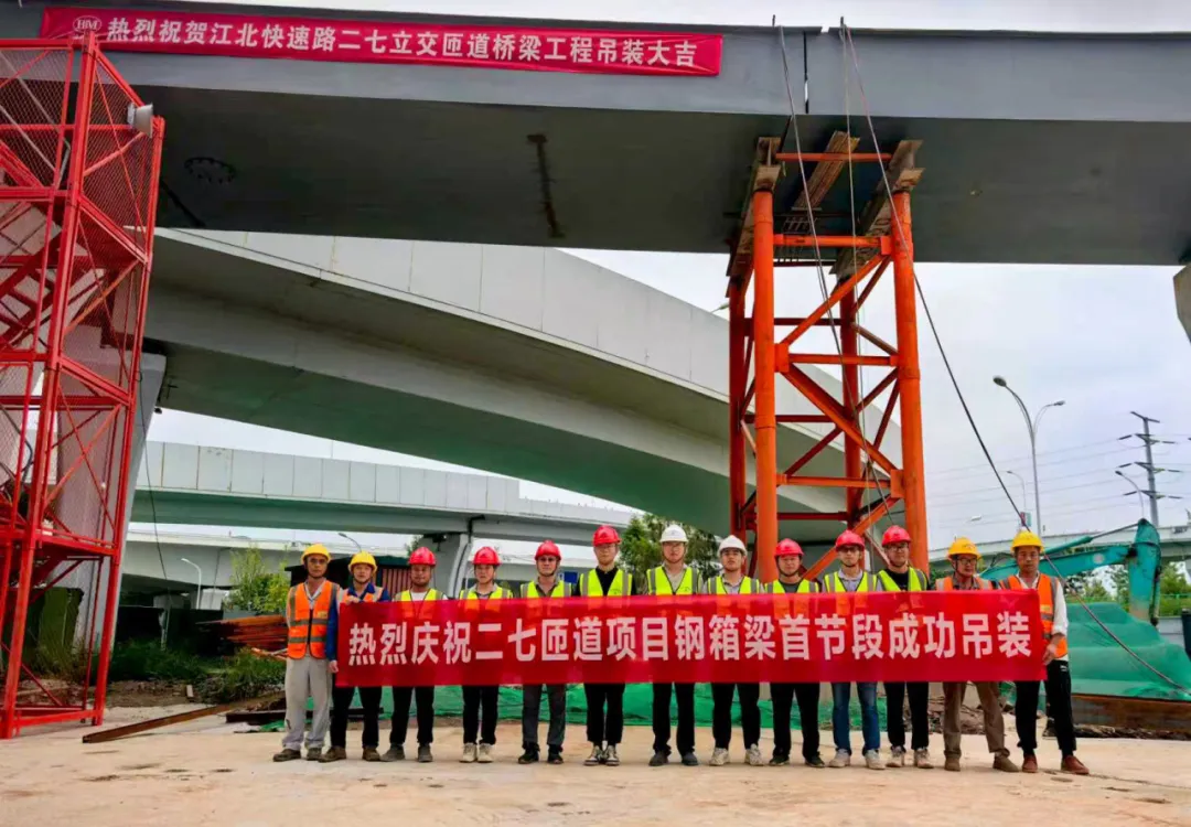 項目直擊丨江北快速路二七立交右轉(zhuǎn)匝道項目鋼箱梁首節(jié)段成功架設(shè)